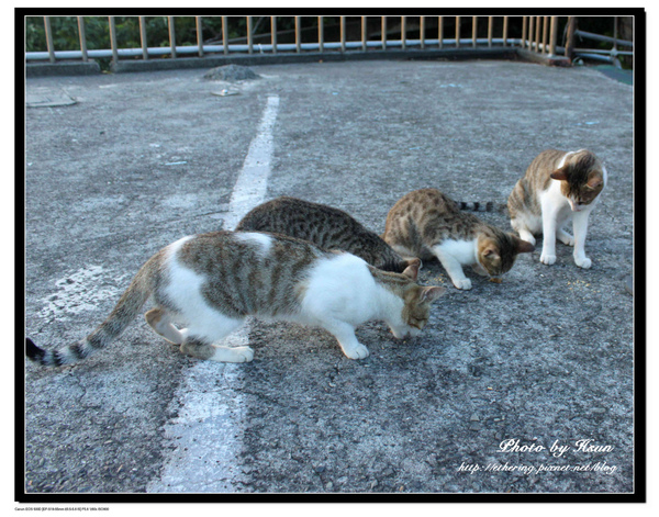 應該是餓極了,一拿出餅乾,紛紛靠近,一小塊一小塊地餵食,貓咪吃東西的樣子真可愛。:)