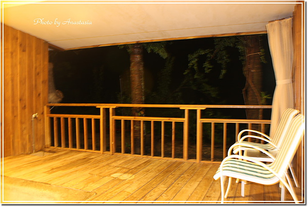 陽臺不小,旁邊還有兩張椅子,泡湯泡累了的時候,可以喝啤酒水休息。XD