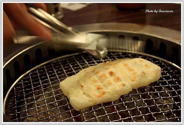 等中間膨脹後,把麻糬外皮烤至微焦,打開中央空心部份。