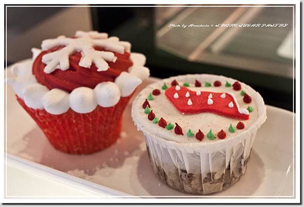 雪花和聖誕襪杯子蛋糕,看到上面圓滾滾的糖霜粒就好開心。:)
