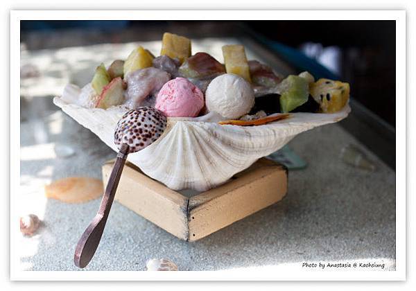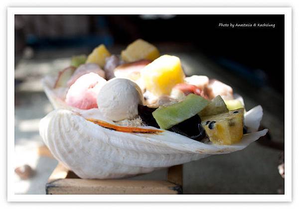 送上來的時候很驚艷,滿滿的水果、冰淇淋裝在大貝殼裡,未入口視覺已充滿清涼感受。