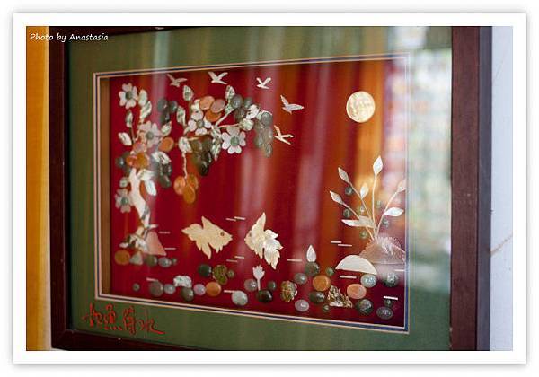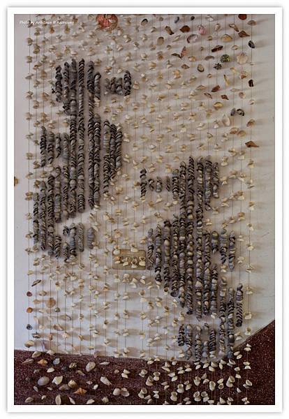 牆上的貝殼拼畫,貝殼真的是一種很實用的東西,可以磨平拋光做為鈕扣、可以整個作為容器、也可以做為飾品。
