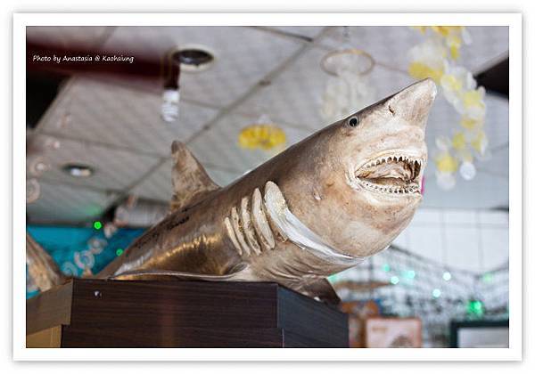 一樓販售各式各樣貝殼製成的紀念品,很有趣的是一進門對著來客疵牙裂嘴的鯊魚標本,栩栩如生。