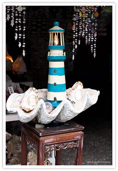 五爪貝和小燈塔,整個充滿海洋氣息,雖然和下面的中式雕花茶几不太襯,噗。