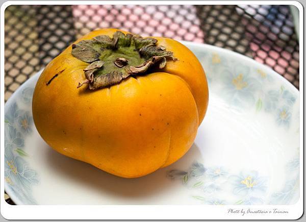 體型碩大的甜柿,多汁甜脆,美麗的鮮豔色澤,忍不住帶到陽台拍外景照。