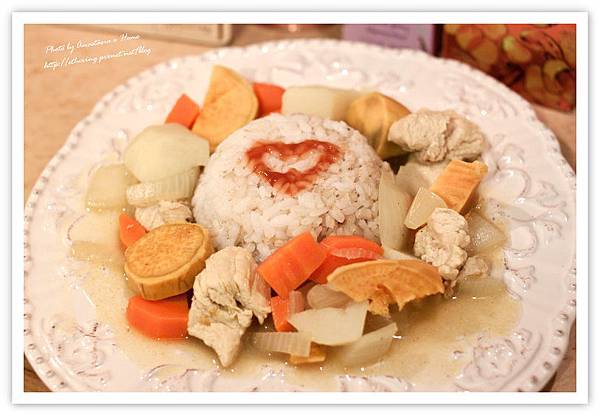 加了地瓜一起燉煮的咖哩飯,有淡淡的甜味,地瓜跟馬鈴薯鬆鬆軟軟的,熱呼呼的吃,好滿足。 :)