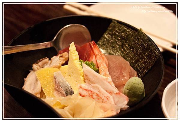 海鮮什錦,滿滿的海鮮食材舖在上面,有鮪魚、旗魚、蟹肉、蝦子、章魚、玉子燒。