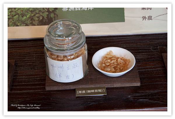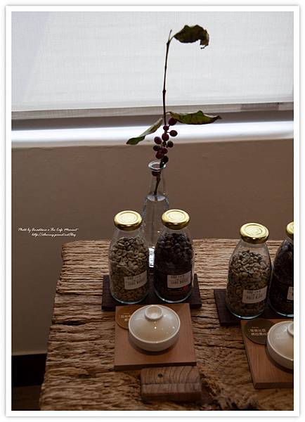 每一種咖啡豆除了研磨好供參觀客人聞乾香的咖啡粉以外,還各有一小瓶生豆與烘焙過的咖啡豆。