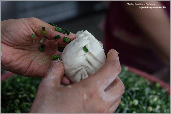 只見阿姨拿起麵皮、舀餡,三兩下就捏好一個包子,速度超快的,而且形狀非常漂亮,不愧是老闆旗下的韭菜包女王。XD