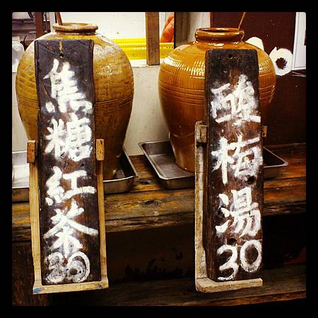 飲料有酸梅湯和焦糖紅茶,旁邊有竹杯+塑膠袋,採自助式。