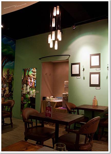 綠色與褐色的木質調森林系裝潢,不知道為什麼與牆壁上的插畫形成一種頹靡衝突的視覺感受。