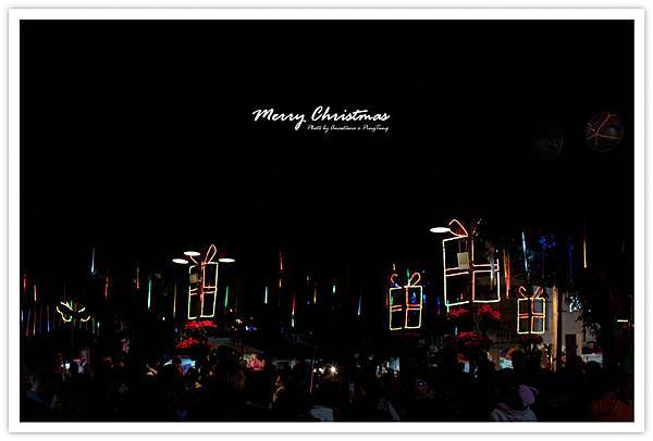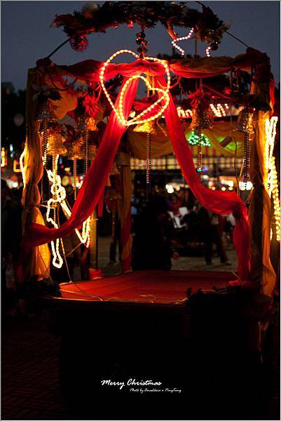 到了晚上,燈飾紛紛亮起,教堂外的街道成了五彩繽紛的遊樂園。
