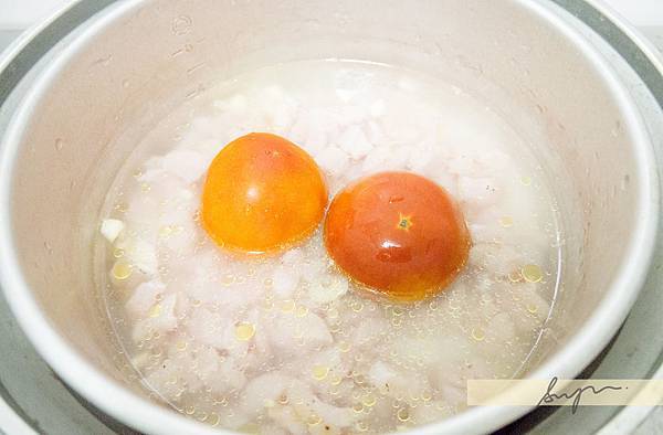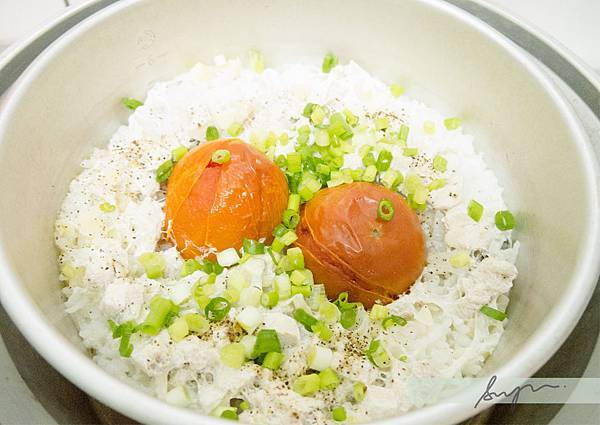 蒜頭切細末,和醃過的雞肉均勻平舖在米上,正中央放上兩顆番茄。