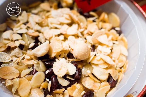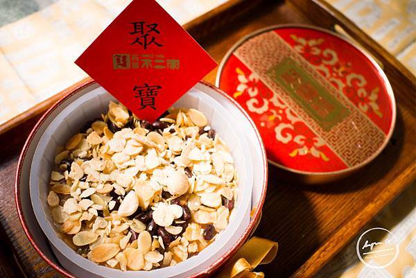 除了聚寶糕上面原有的乾果,還會另外附上一包堅果類,裡面有夏威夷果仁、杏仁片,可以自己撒上去。