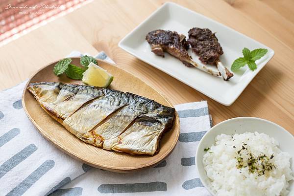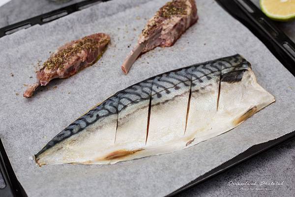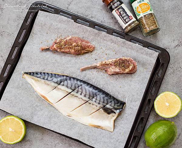 前ㄧ晚先把鯖魚和小羊排拿到冷藏解凍,雙面輕抹上些橄欖油和黑胡椒,小羊排還多灑了一點義大利香料在表面增加香氣。